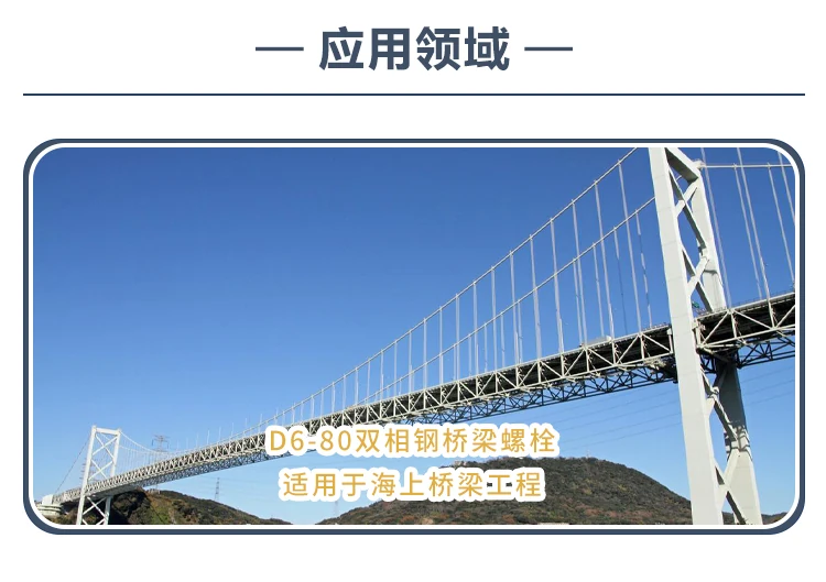 栢尔斯道弗生产的【D6-80双相钢桥梁螺栓】采用双相不锈钢材质,盐雾测试1000h无红锈,氯化物耐受浓度≤50000mg/L,符合IS03506认证,适用海上桥梁工程,D4-80(800MPa抗拉)
